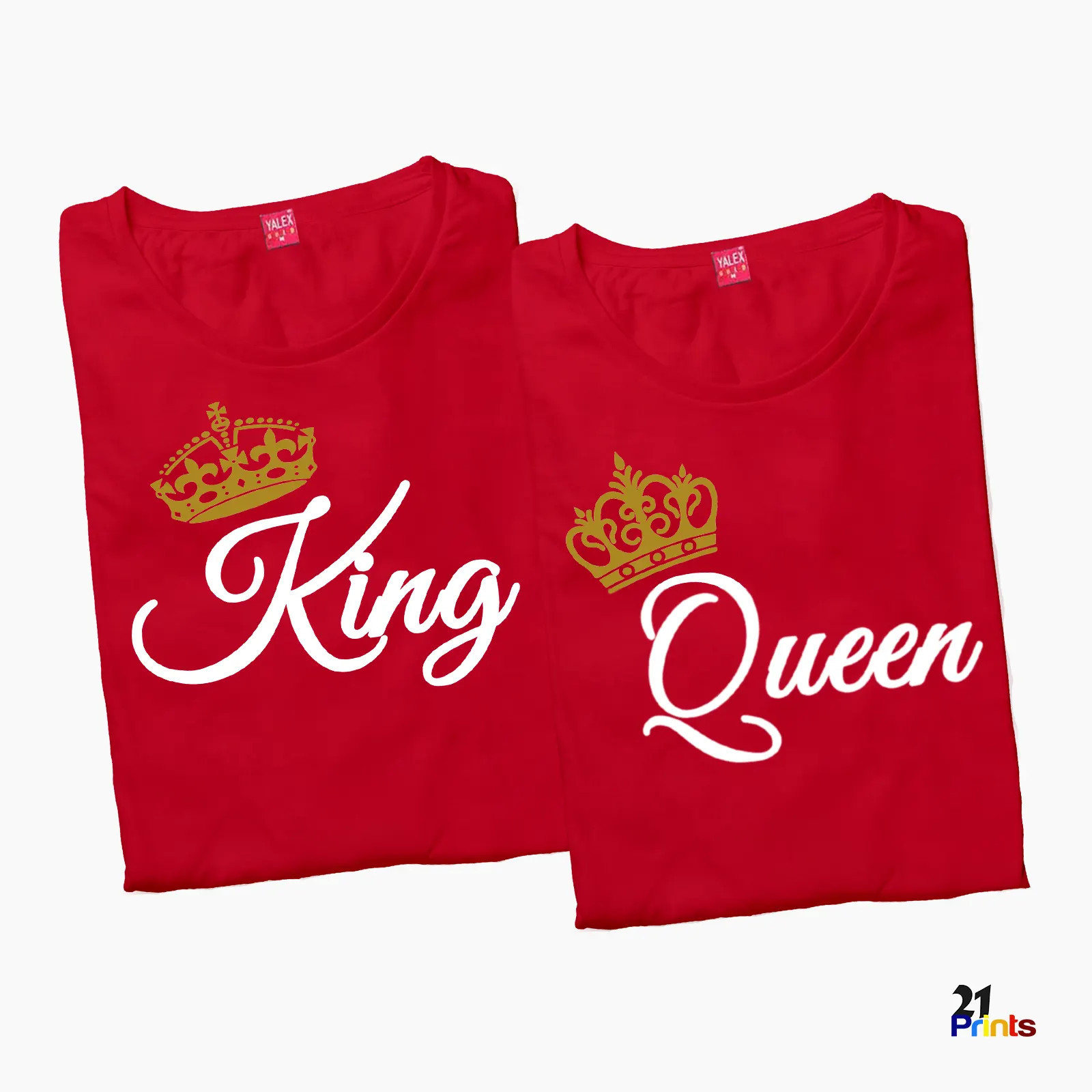 A stylish matching couple T-shirt set featuring elegant gold crown graphics and bold “King” and “Queen” lettering—perfect for couples who love to rule together.
