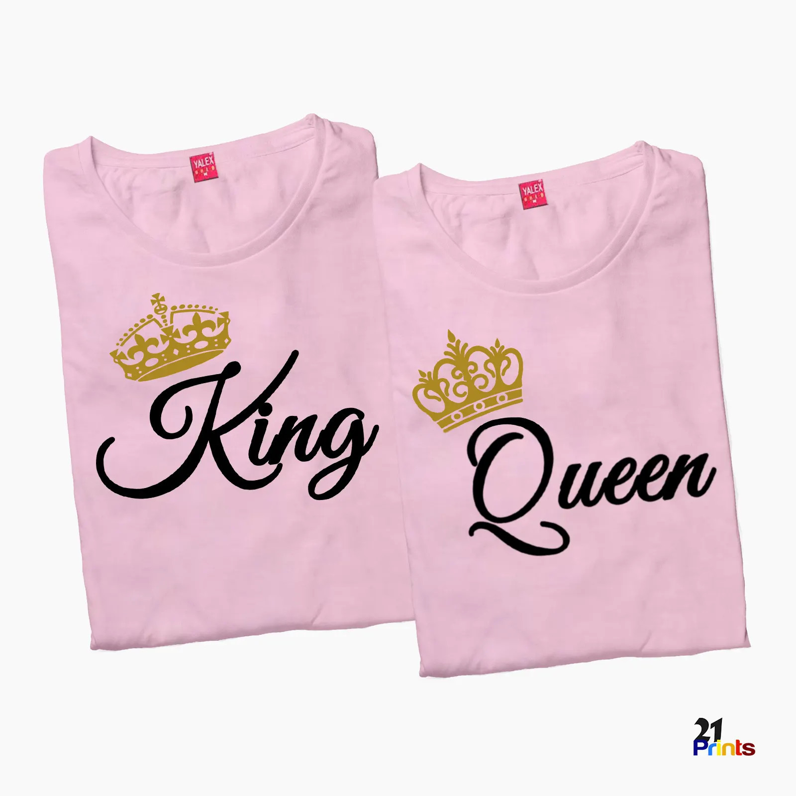 A stylish matching couple T-shirt set featuring elegant gold crown graphics and bold “King” and “Queen” lettering—perfect for couples who love to rule together.