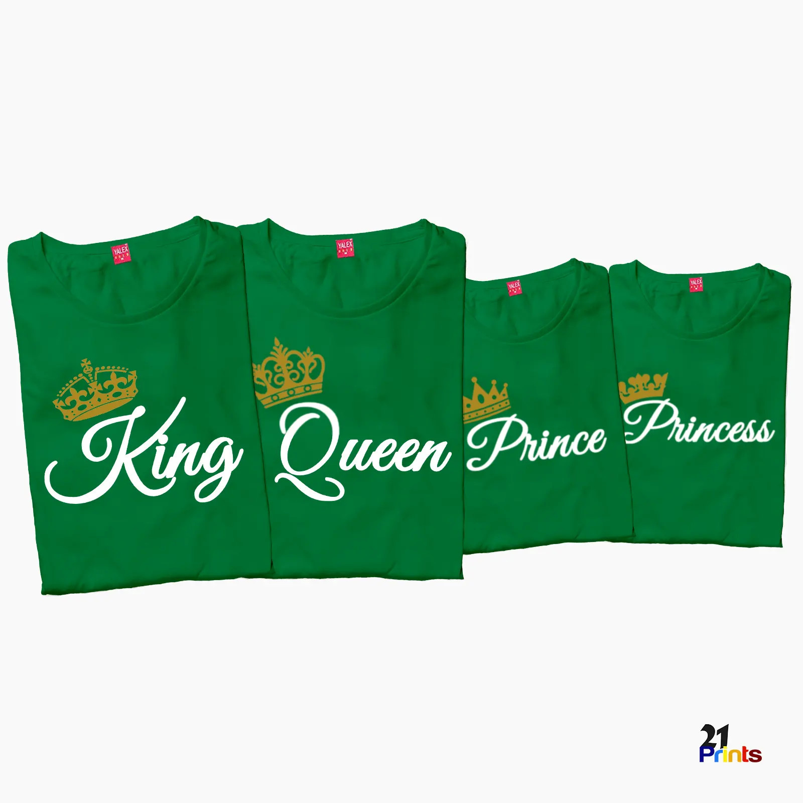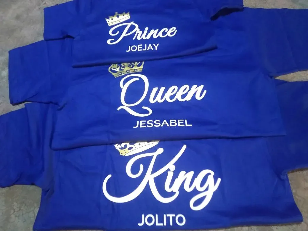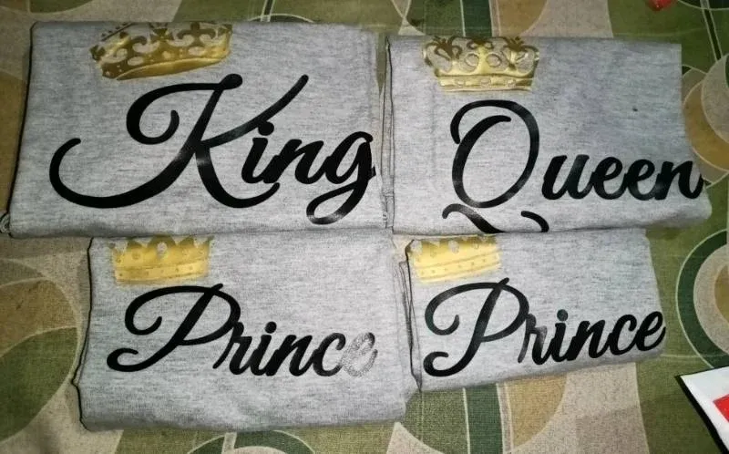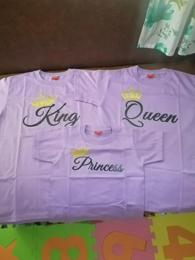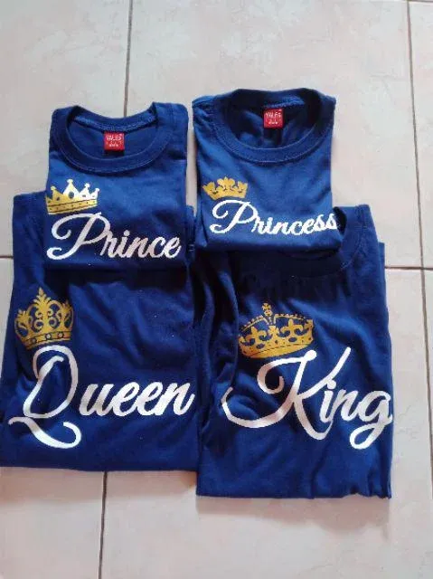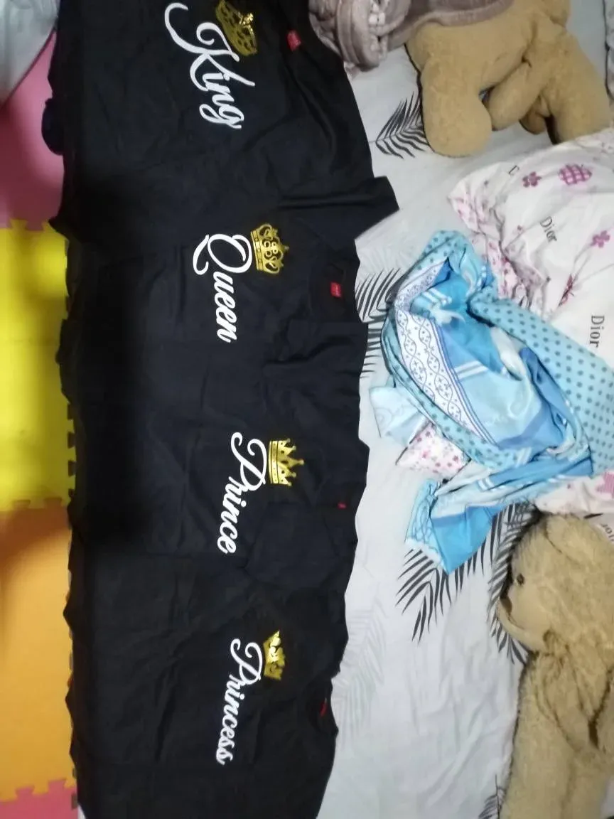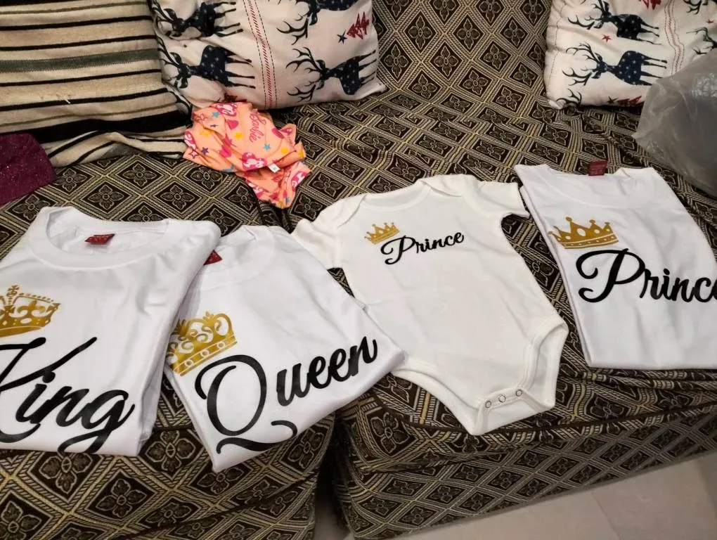 A matching royal family shirt set featuring elegant crown designs and “King, Queen, Prince, Princess” prints—perfect for stylish family bonding, photos, and special occasions.