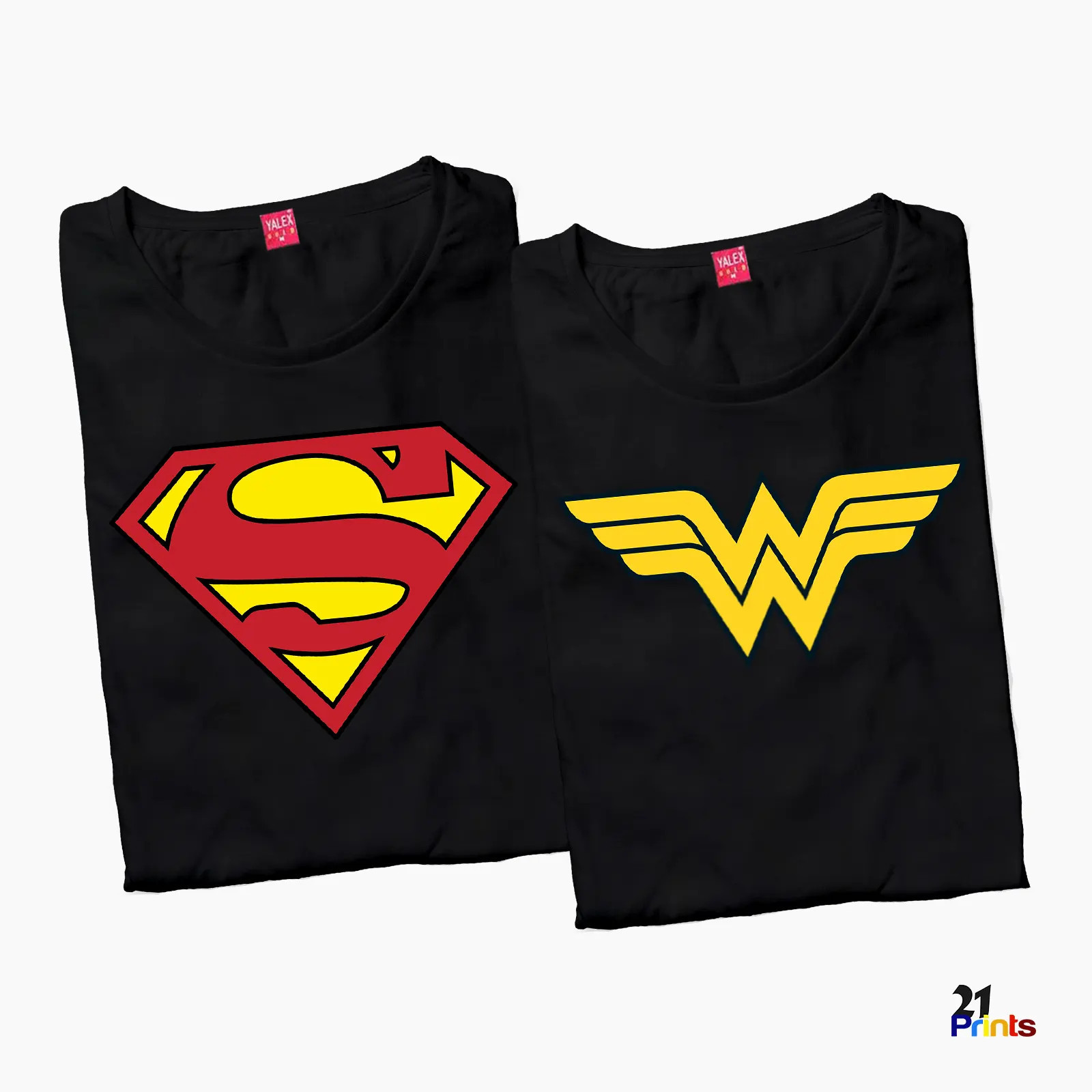 A vibrant couple’s T-shirt set featuring bold comic-style hero emblems — a powerful “S-shield” design on royal blue and a striking “winged W” emblem on bright red. Perfect for fun, dynamic couples.