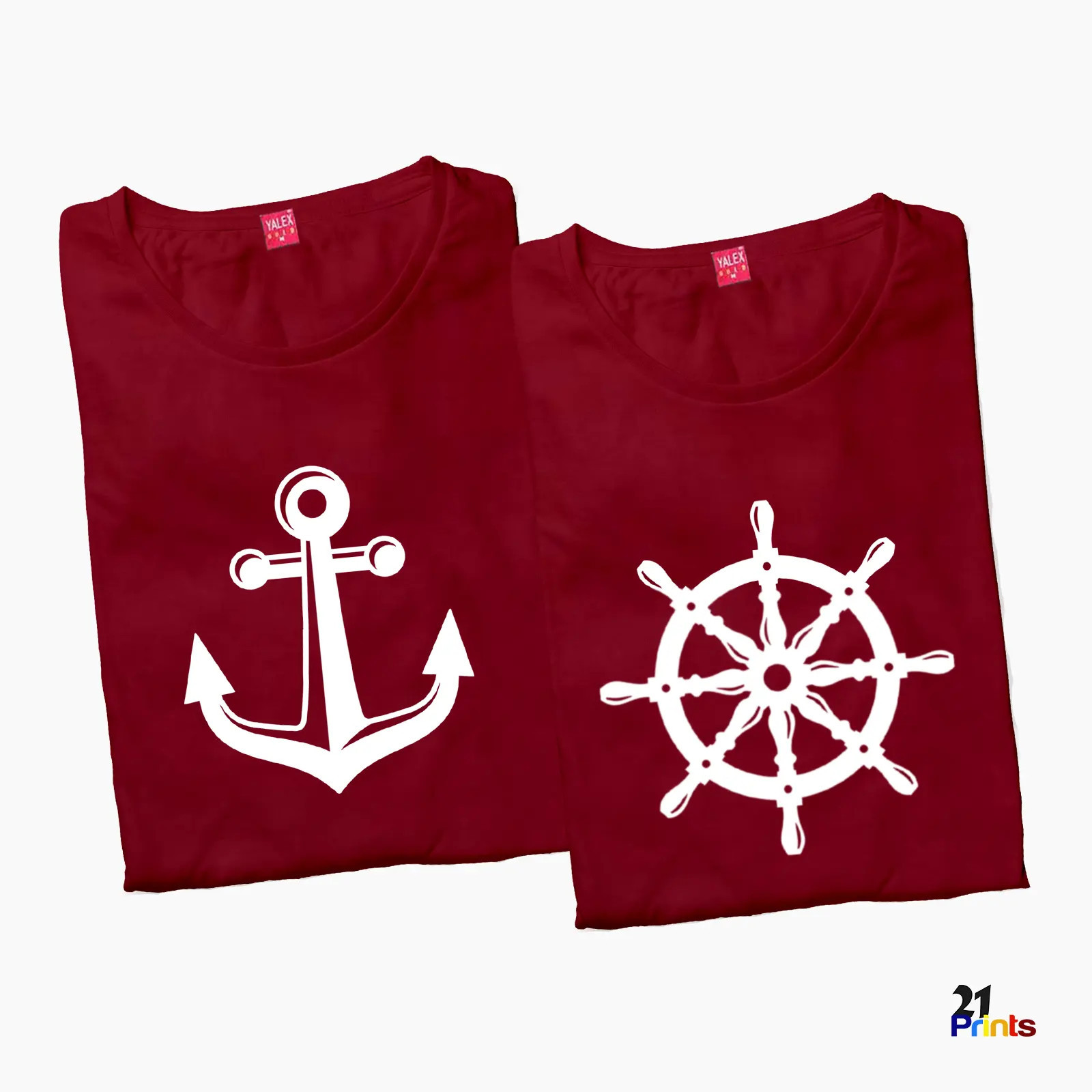 Bring classic maritime vibes to your wardrobe with the Nautical Duo – Anchor & Helm Steering Wheel Couple T-Shirt. This matching set includes two t-shirts, each showcasing an iconic sea-inspired symbol: a strong anchor representing stability and strength, and a traditional ship’s wheel symbolizing direction and adventure.<>