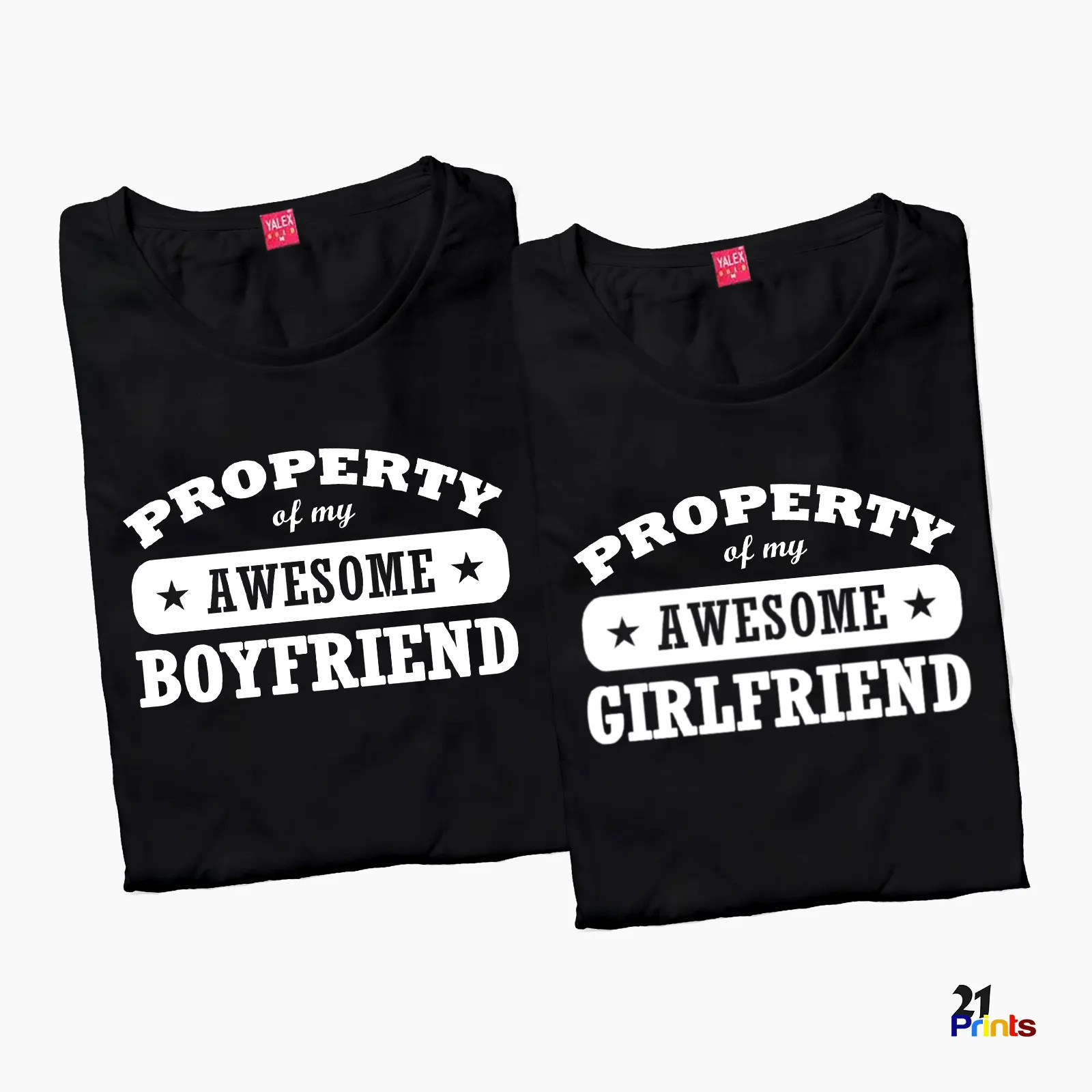 A fun and bold matching t-shirt set for couples, featuring playful “Property of My Awesome Boyfriend/Girlfriend” prints.