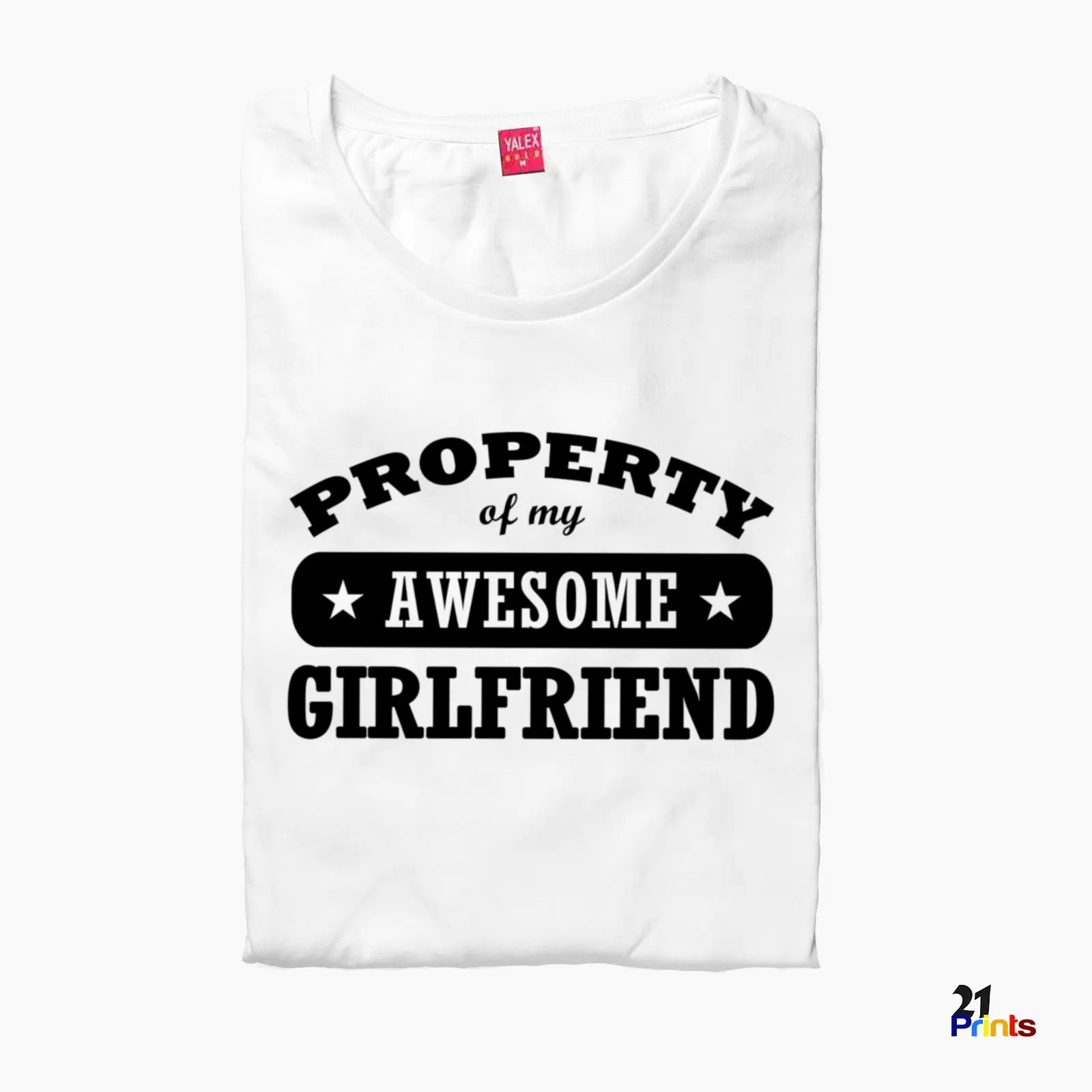 A fun and bold matching t-shirt set for couples, featuring playful “Property of My Awesome Boyfriend/Girlfriend” prints.