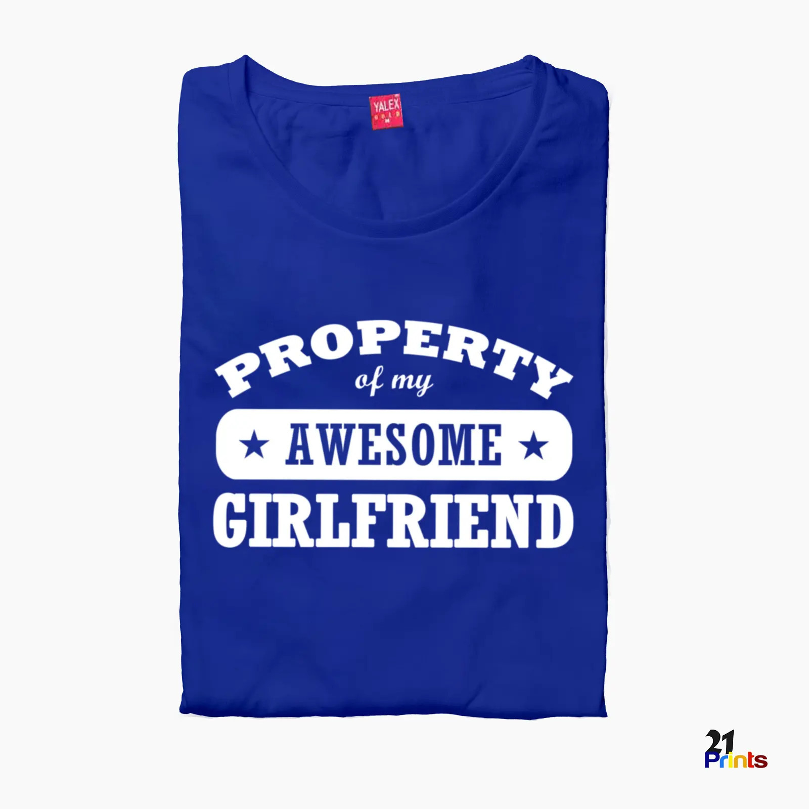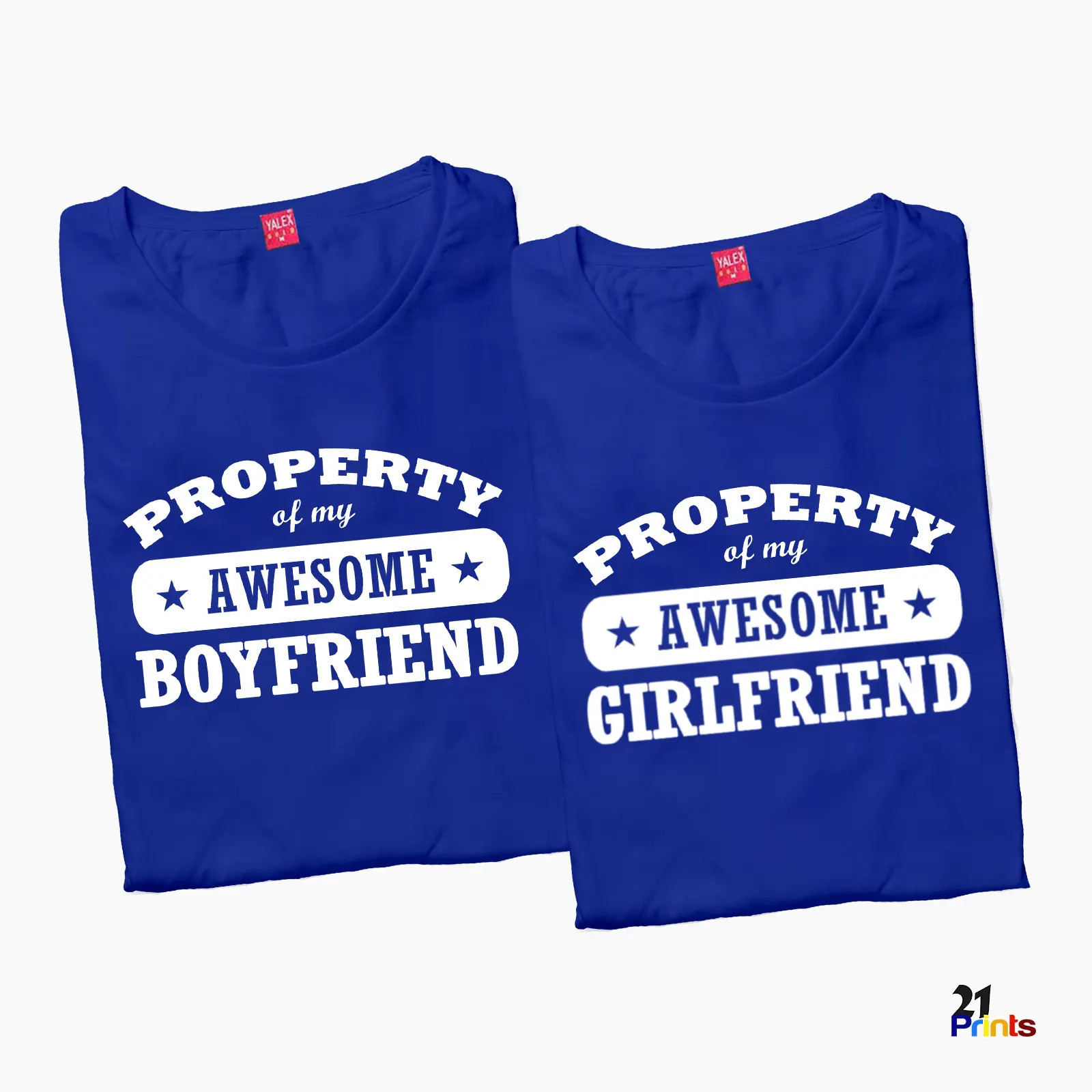 A fun and bold matching t-shirt set for couples, featuring playful “Property of My Awesome Boyfriend/Girlfriend” prints.
