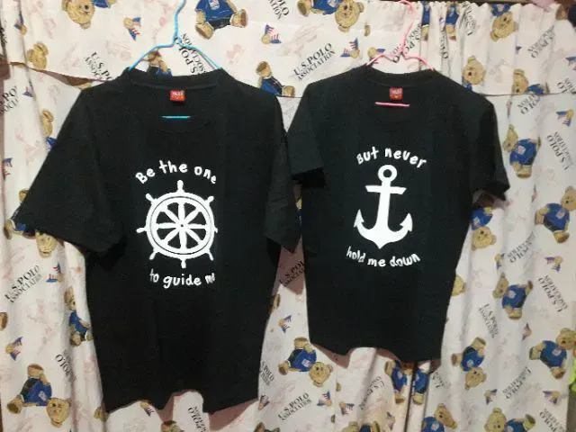 A meaningful couple shirt featuring a helm and anchor design with the quote “Be the one to guide me, but never hold me down”—perfect for couples who support and strengthen each other.