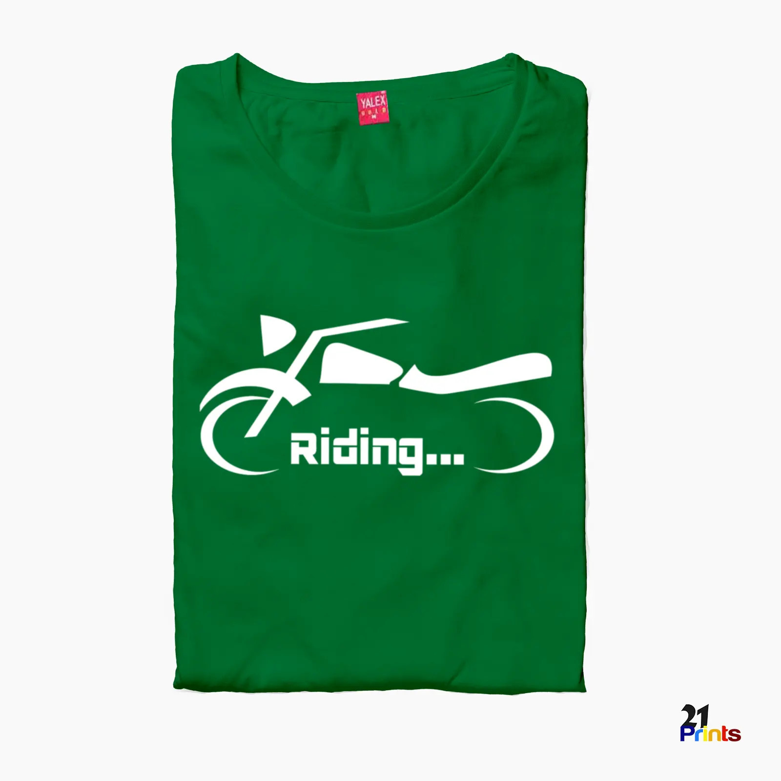 A matching couple T-shirt set featuring a minimalist motorcycle graphic and the phrases “Riding…” and “…in tandem,” perfect for partners who love adventure and riding together.