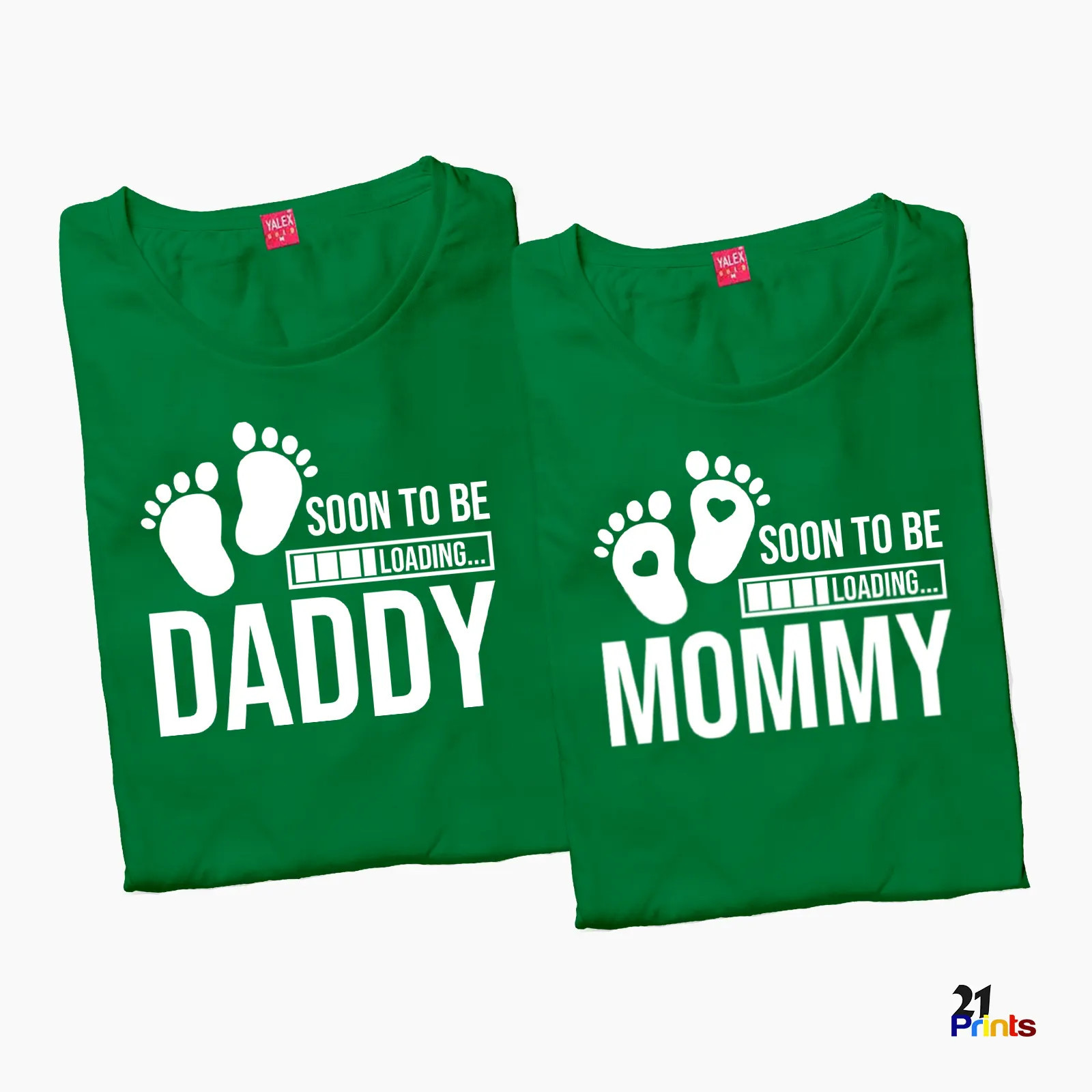 A cute matching T-shirt set for expecting parents, featuring baby footprints and a loading bar with the phrases “Soon to Be Daddy” and “Soon to Be Mommy.” Perfect for pregnancy gender reveals, photoshoots, and celebrations.