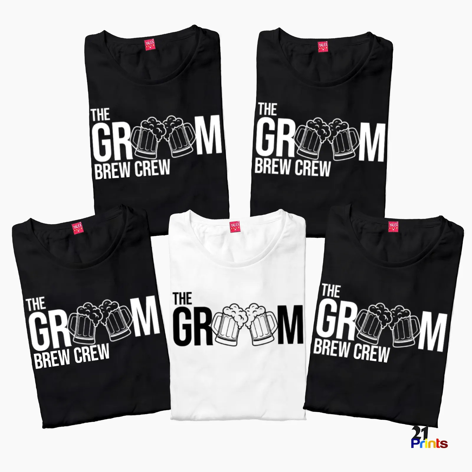 A fun matching T-shirt set for the groom and his squad, featuring beer mugs and bold typography. Perfect for bachelor parties, pre-wedding celebrations, and group photos.