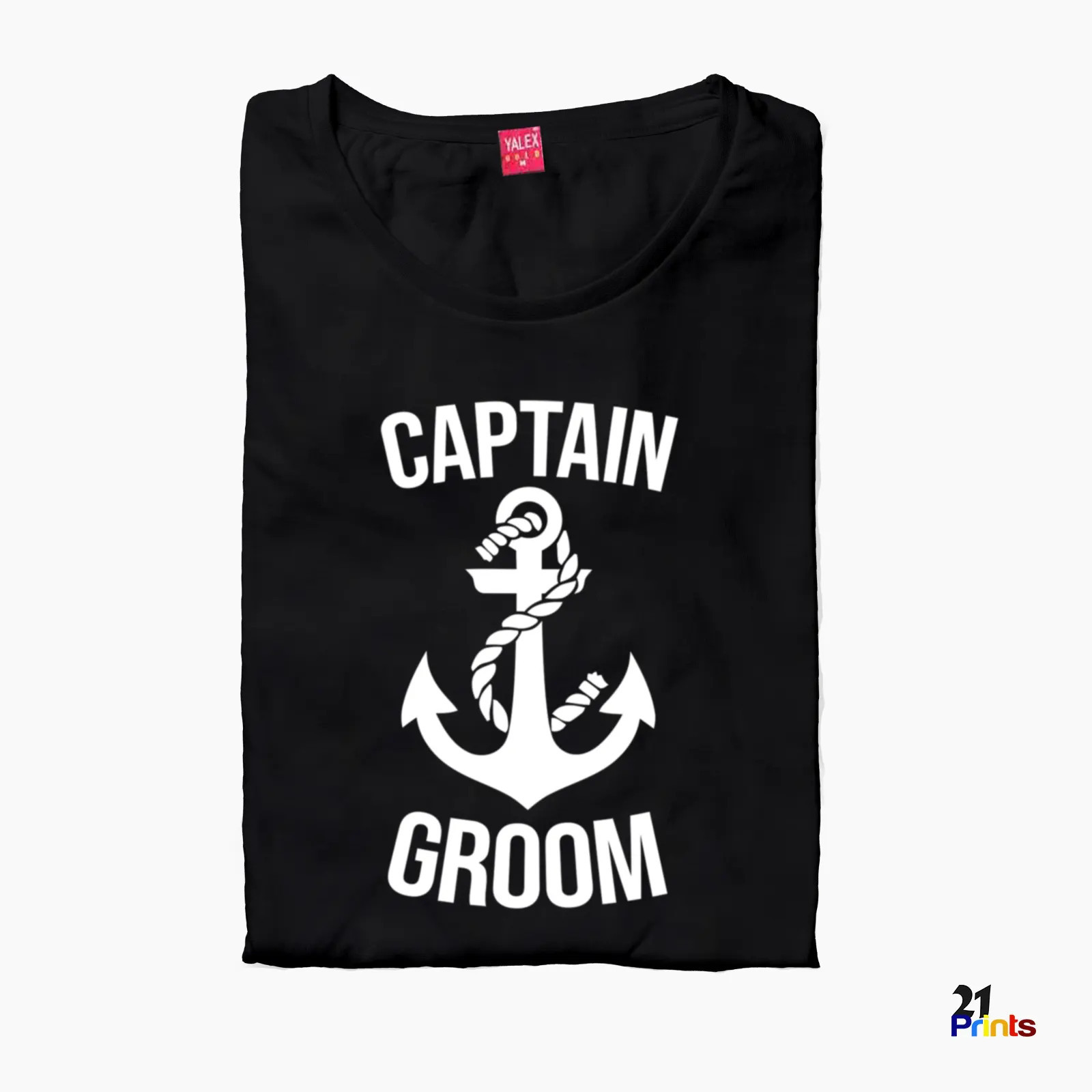 A coordinated set of nautical-themed bachelor party T-shirts featuring matching “Groom’s Crew” designs for the squad and a standout “Captain Groom” shirt for the groom, perfect for celebrations on land or sea.