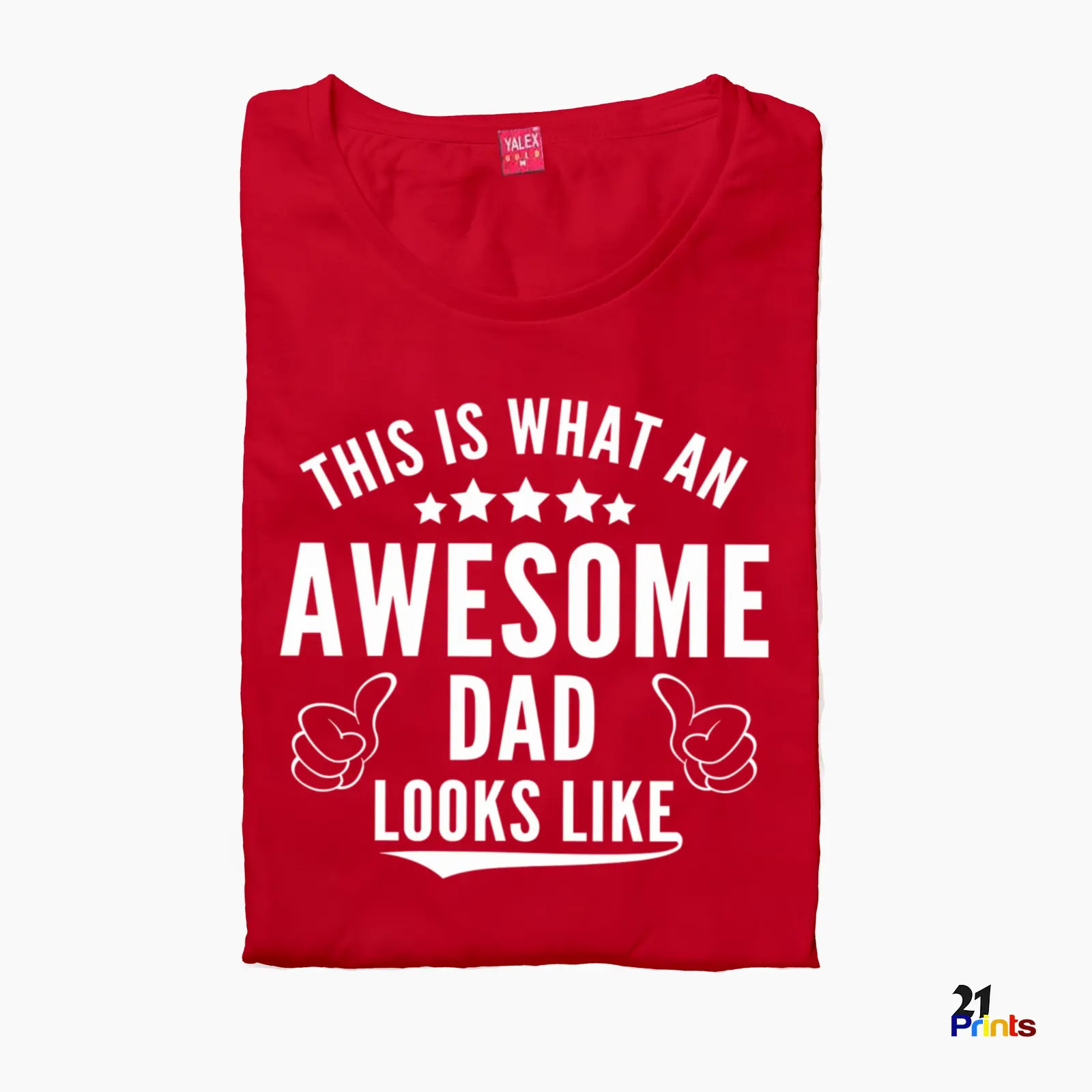 A bold and fun T-shirt featuring the message “This Is What an Awesome Dad Looks Like,” complete with stars and thumbs-up graphics—perfect for gifting any proud and amazing dad.