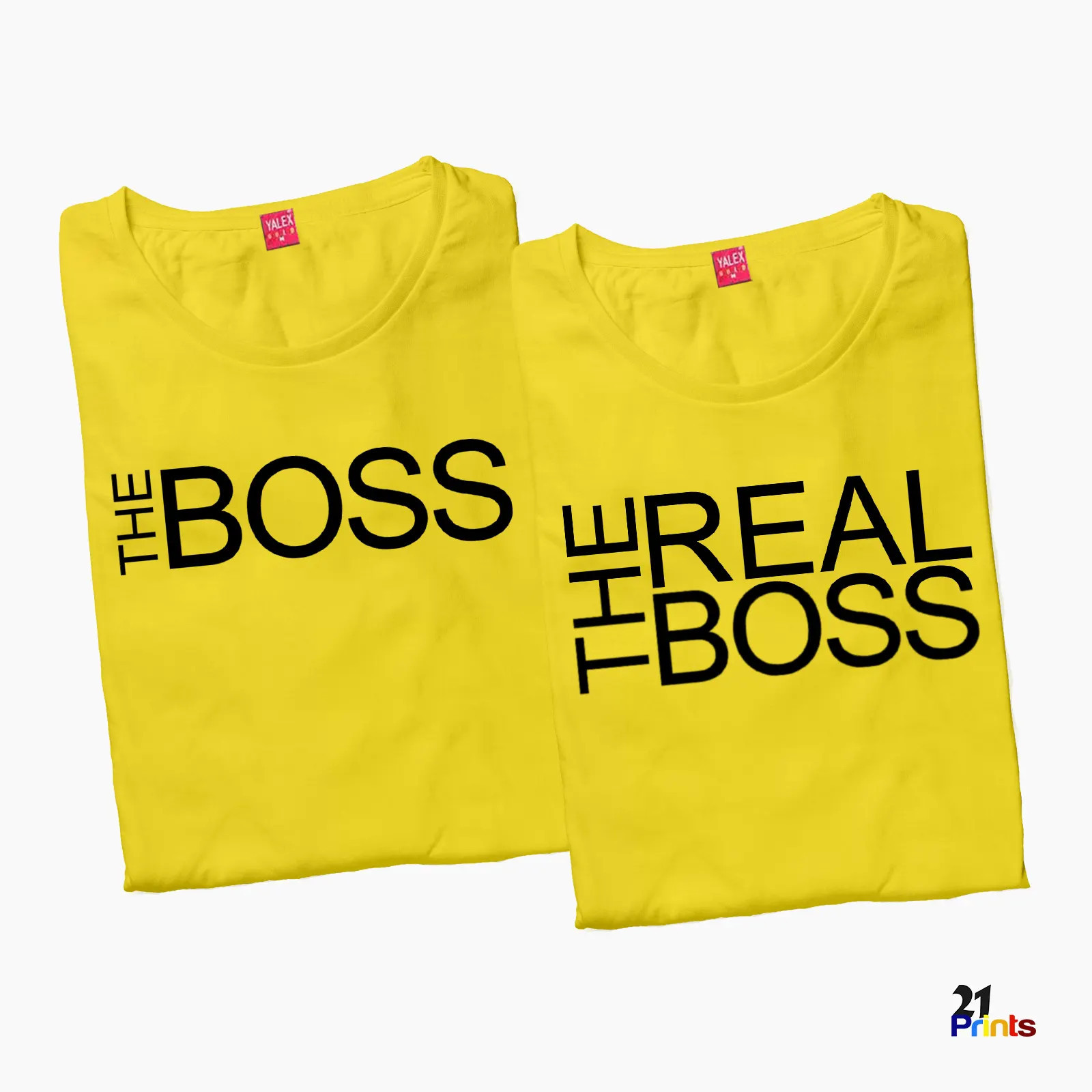 A fun and stylish matching T-shirt duo featuring bold “THE BOSS” and “THE REAL BOSS” prints—perfect for couples who love playful, coordinated outfits.